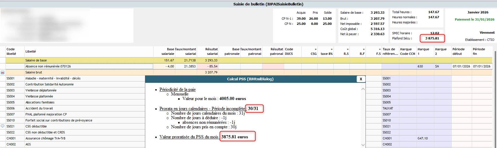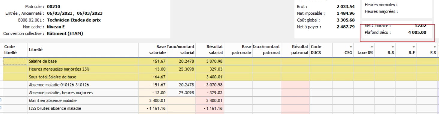 Test fait sur un salarié sans maintien et on a alors dans les deux cas un PSS à 0.