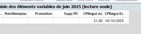 Bonjour, dans éléments variables, profil : ensuite mettre un commentaire et ne pas hésitez à utiliser le courrier pré rempli par Silaé pour tout bien notifier pour pas que la salarié réclame son du...se mettre sus la salariée concernée, sur l’onglet modèle et prendre modèle pour info CP maladie et l’adapter à votre situation. je ne sais pas si vous avez utilisé le profil CPREGDDADU, car il faut mettre une date de fin. si trop compliqué: un courrier et commentaire sur le BS.