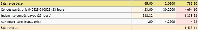 Au mois d’Août il prend 23 jours de congés. Ils sont retenue via la méthode du maintien donc le taux est à temps partiel. Pour l’indemnité, je n’arrive pas à retrouver le montant :
