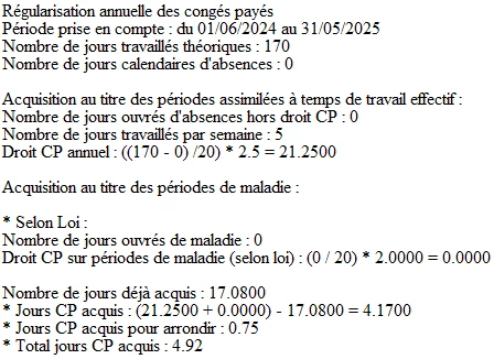 - 17.08 CP ont été acquis en temps plein (07/0/2025 au 30/04/2025)