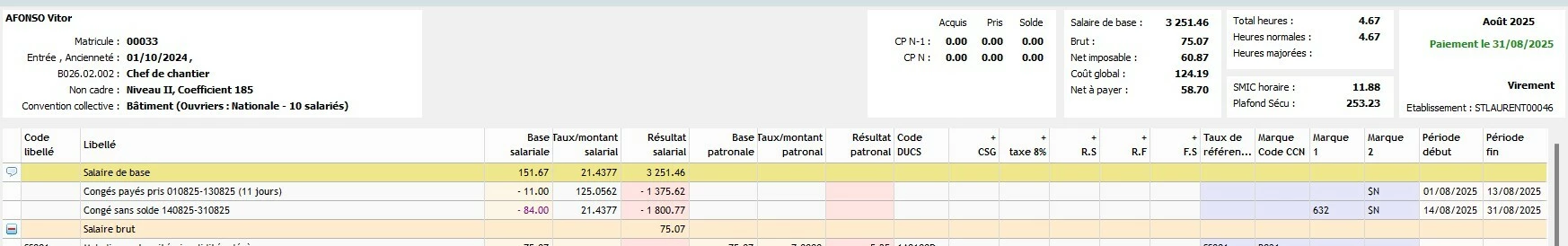 Le salarié est absent tout le mois une partie en cp btp et une partie en sans solde.