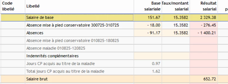 La mise à pied sur la période de juillet est déduite sur le bulletin d’août, alors que les jours de juillet avaient déjà été retirés au titre de l’arrêt maladie → ce qui entraîne une double déduction.