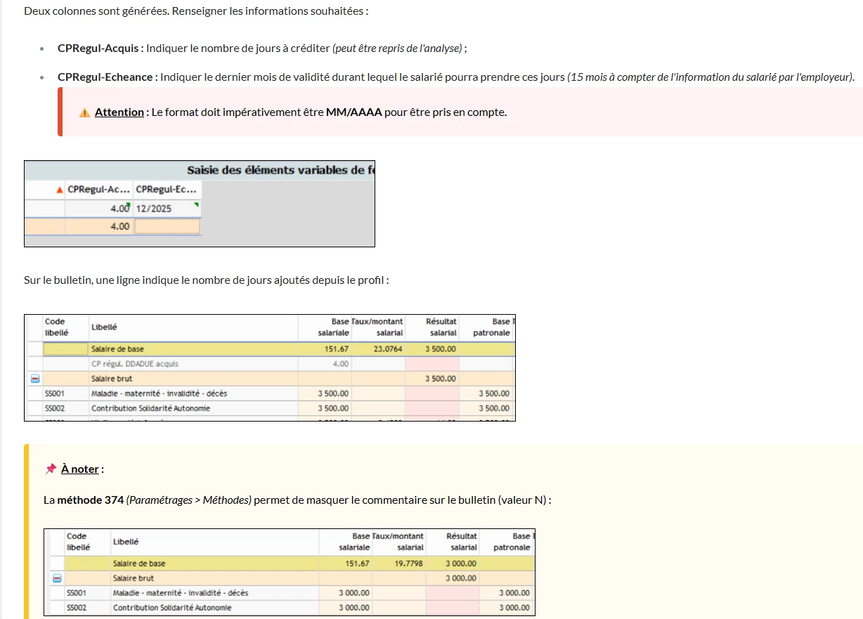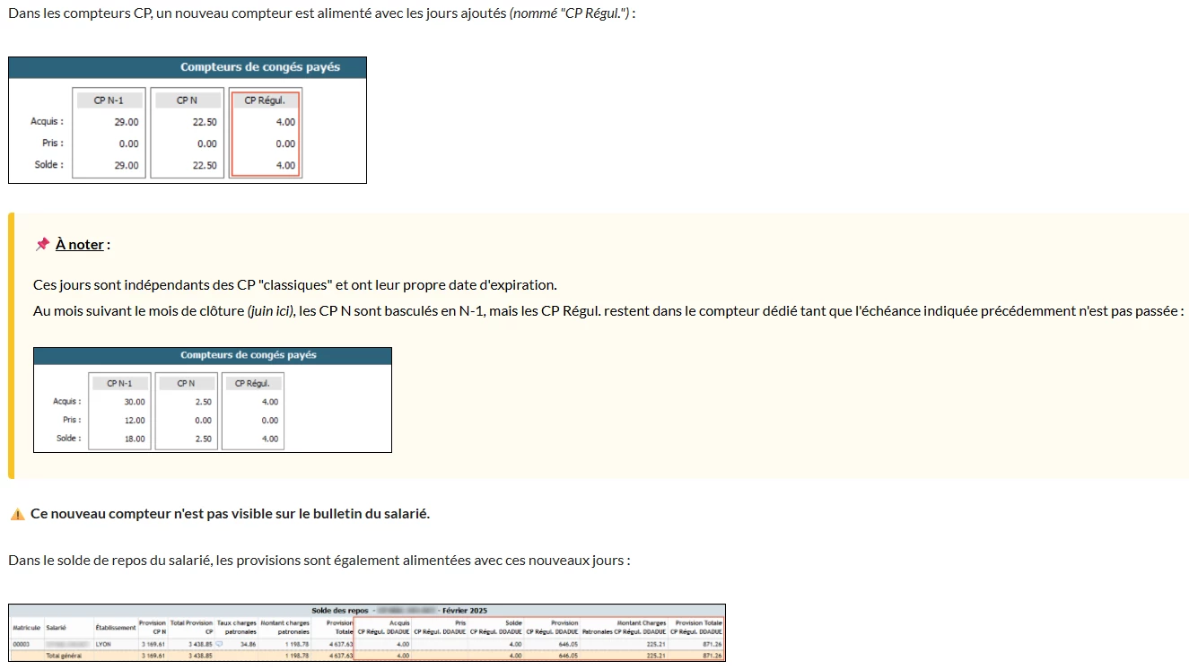 Des colonnes spécifiques s’affichent sur le solde de repos, mais les CP restent utilisables.