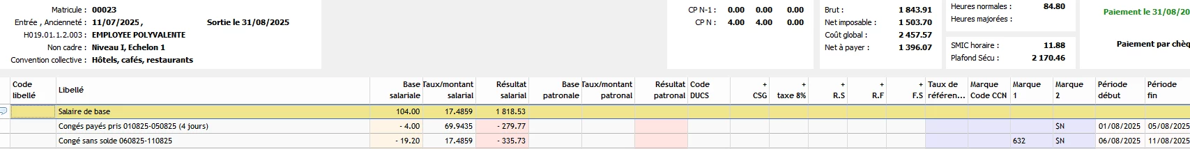Le nombre d’heure calculé en absence sans solde est correct et j’ai donc en heure payée 84h.