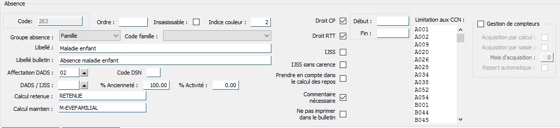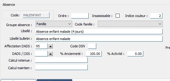 Bonjour, j’ai créé l’absence “Maladie enfant” dans Paramétrage → Absences -> Paramétrage des absences. Comme détaillé dans l’aide en ligne “Créer des règles d’indemnisation de l’absence”: