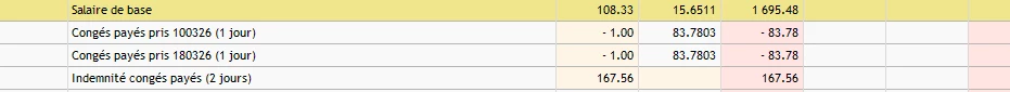 Sur le bulletin de salaire d’avril, 4 jours de CP lui sont décomptés et 1 jour de CP sur la paie de mai (soit 5 jours). S’il avait été à temps plein, uniquement que 4 jours lui aurait été décomptés.
