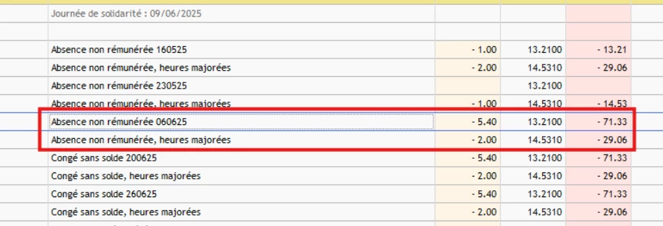 Habituellement, si le salarié est absent une journée, j’ai cette déduction :
