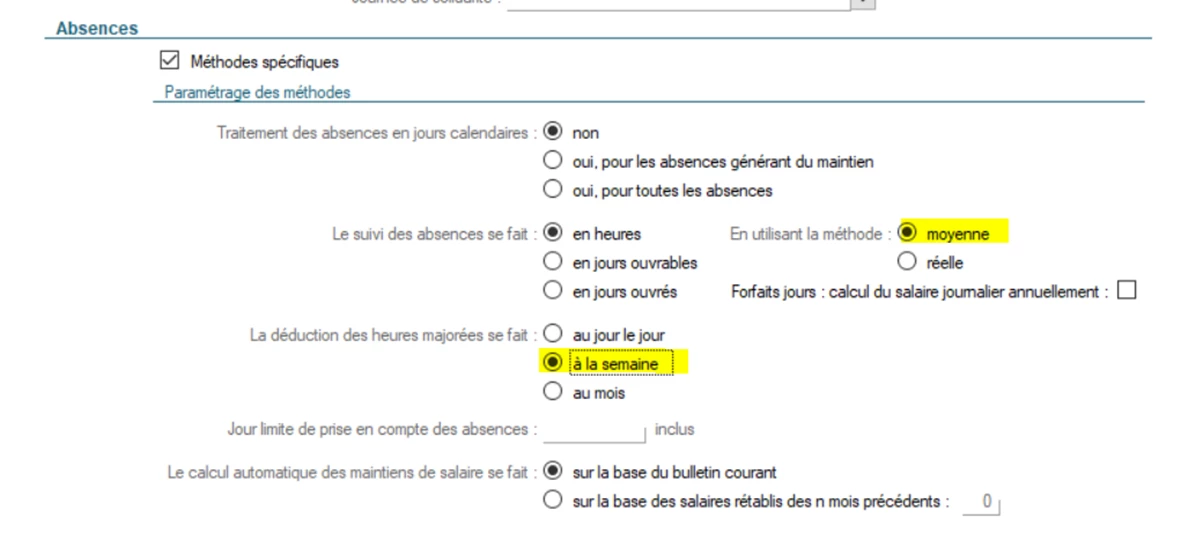 Pour qu’elles soient déduites intégralement j’ai testé tous les paramétrages d’absence et le seul qui déduit intégralement les 17.33H c’est “déduction à la semaine” et méthode moyenne”.