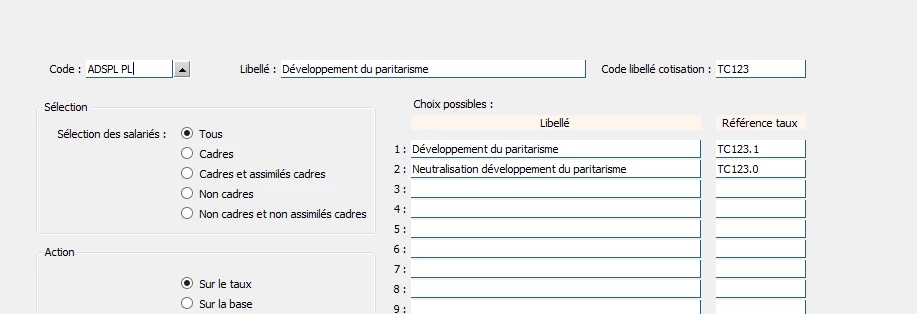 A part renseigner le taux du libellé TC123 à 0.04% pour que la cotisation apparaisse sur les bulletins, y a-t-il la possibilité de renseigner cet assujettissement sur la fiche société ?