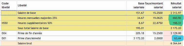 Attention si vous avez paramétrée un “Libellé prime” en ayant coché “Rentre dans le calcul de majoration du taux horaire pour absences” la prime sera également incluse au prorata dans le calcul des exonérations HS/HC sociale (11,31%) et fiscale.