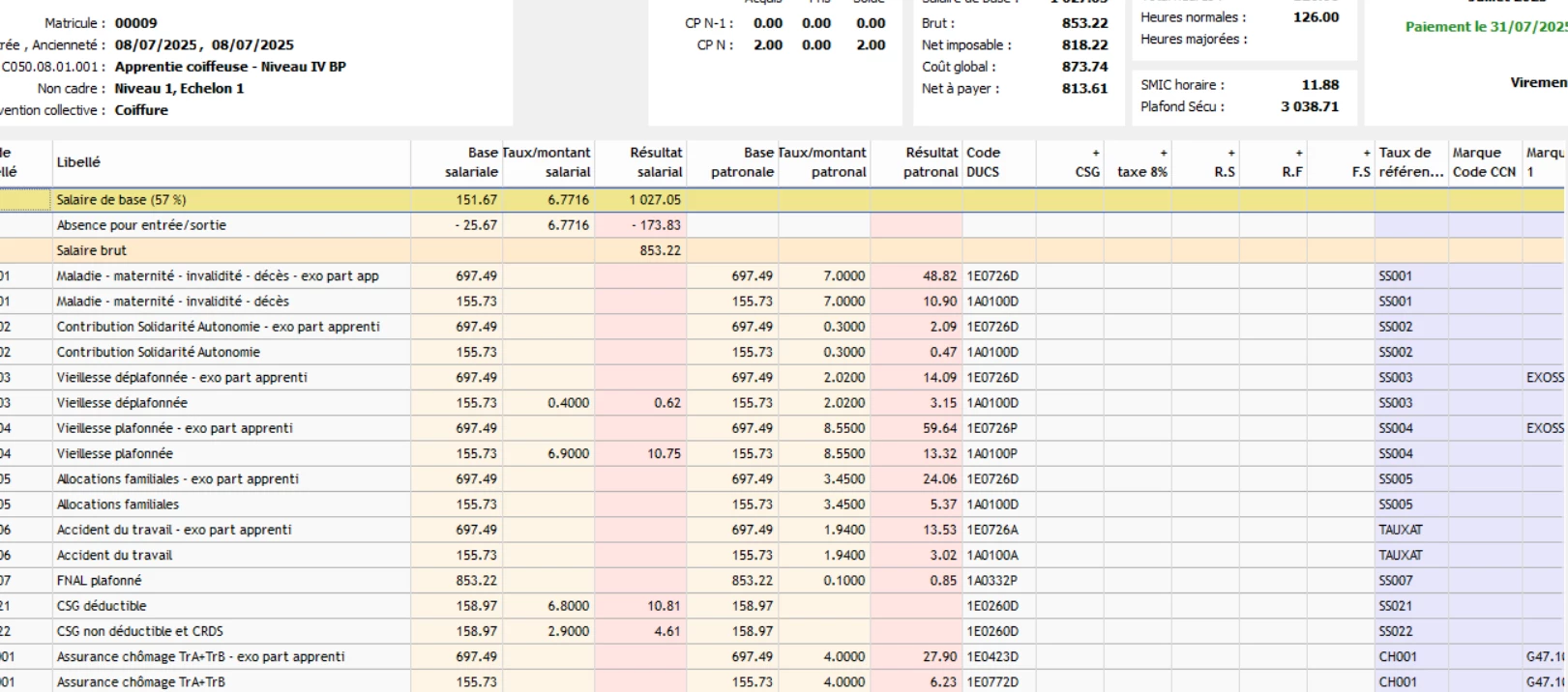 Apprenti embauché le 08/07/2025. Total travaillé 126 heures.