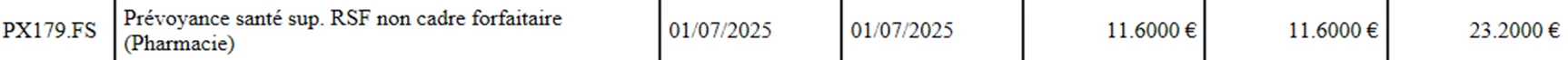 - la cotisation santé CPL (qu’elle nomme “RSF+) forfaitaire : 23.20 euros (qui n’existe pas sur silae mais qui a l’air de correspondre à la PX179 réservée aux non cadres)
