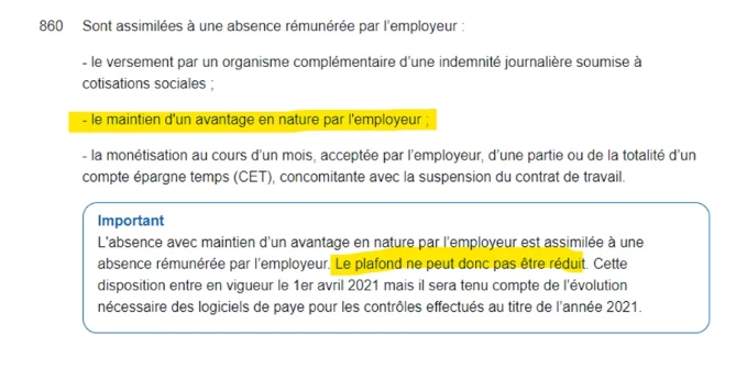 L'absence avec maintien d’un avantage en nature par l’employeur est assimilée à une absence rémunérée par l’employeur. Le plafond ne peut donc pas être réduit.