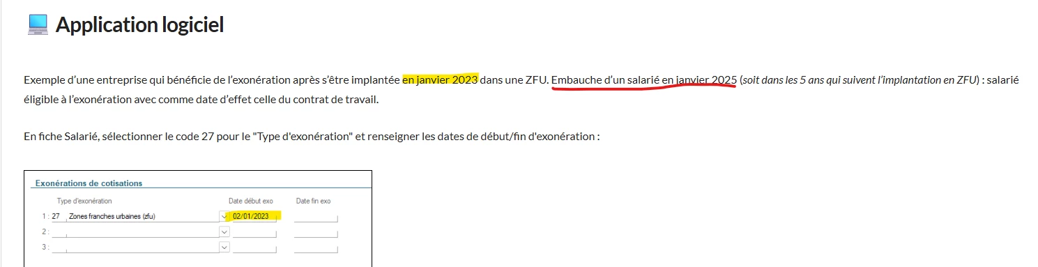 Bonjour, j’ai paramétré le salarié avec l’exonération 27 de ZFU. Cependant, quelle date de début et de fin faut il renseigner svp ? la date de début est celle de la création d’entreprise comme indiqué dans la base de connaissances silae ou celle de la date de début de contrat du salaré. Concernant la date de fin , faut il compter 7 ans à compter de la date de début de contrat renseignée svp ?