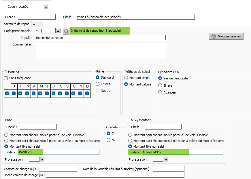 Dans un dossier, j’ai paramétré une prime pour l’application automatique des repas sur les bulletins chaque mois en fonction des jours travaillés :