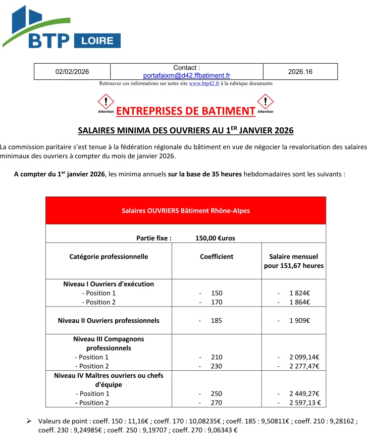 Pour les adhérents à la FFB les salaires minima pour la région Auvergne Rhône-Alpes ne sont pas à jour. Il y aurait du avoir au 01.01.2026 une évolution salariale pour les Ouvriers et ETAM.