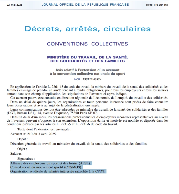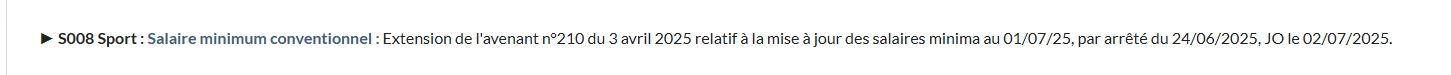 Après recherches, j’ai trouvé l’avenant n°210 du 3 avril 2025 mais pour moi, il ne serait applicable qu’aux organisations suivantes : Alliance des employeurs du sport et des loisirs (AESL). Conseil social du mouvement sportif (COSMOS). Organisation syndicale de salariés intéressée rattachée à la CFDT.