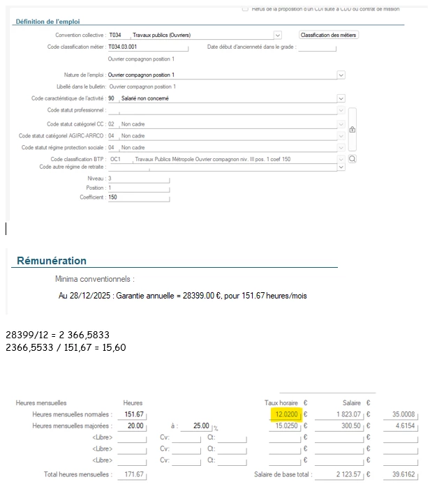 Le minimum conventionnel pour la catégorie concernée est 15,60€/h. Pourtant dans la rémunération, le taux horaire est le SMIC.