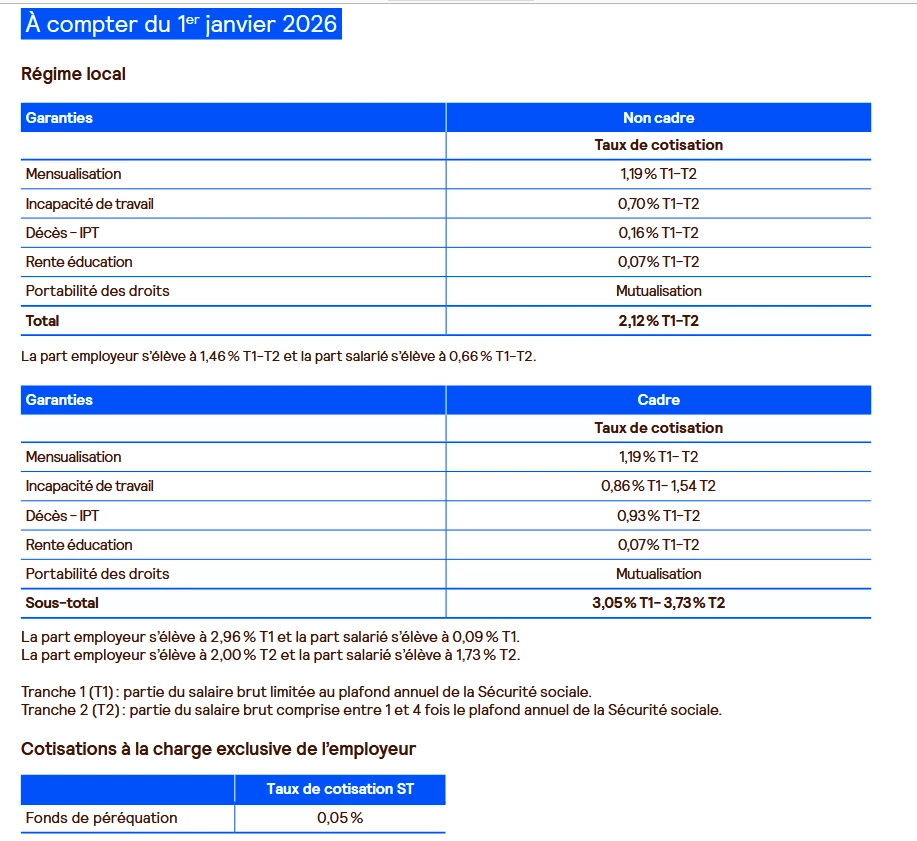 Remarque : nous n'avons pas mis à jour les taux du régime Alsace Moselle car le doc en notre possession ne les mentionne pas. Si elle est en votre possession n'hésitez pas à nous la faire parvenir.