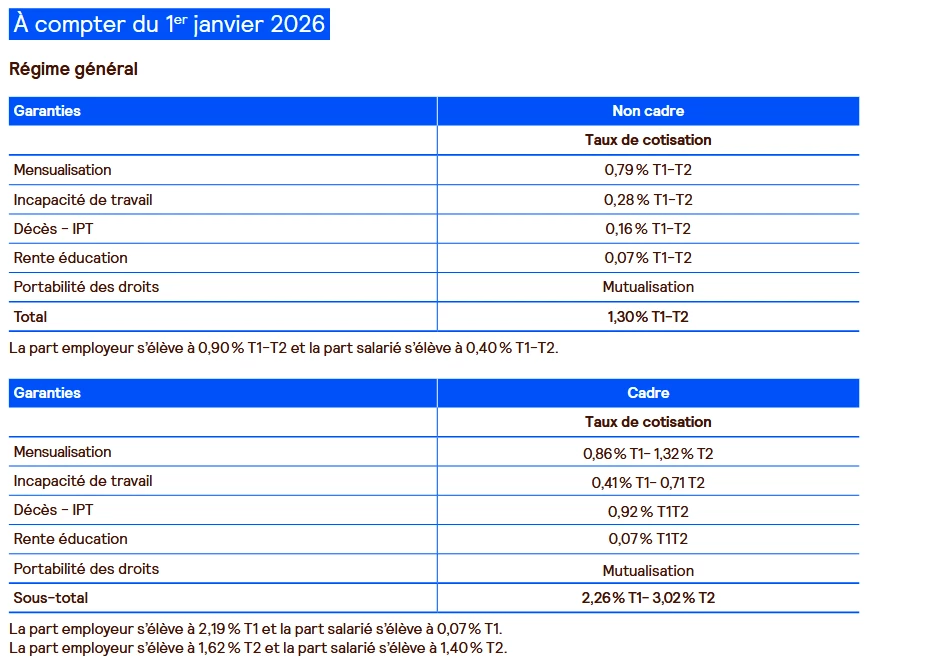 Mise à jour des taux prévoyance au 01/01/2026 (source doc AG2R)
