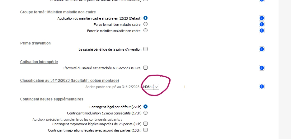 je suis entrain de monter un dossier où ils ont la CCN métallurgie M110. Afin que la prime d’ancienneté soit bonne et ajoute si besoin par rapport à la M064, je dois mettre dans la fiche salarié > questionnaire conventionnel l’ancien poste occupé :