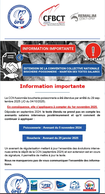 Nous avons été avertis par le syndicat de la Poissonnerie de la Fusion de la CCN Boucherie avec celle de la Poissonnerie au 01/11/2025.