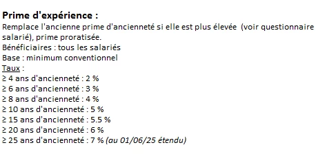 Le salarié bénéficie de la prime d’expérience. La base de la prime expérience comprend la rémunération des heures d’avenant ce que la cliente conteste.