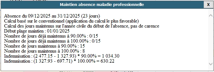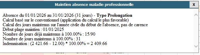 Je me permets de vous contacter aujourd'hui pour obtenir des éclaircissements sur le fonctionnement du logiciel. J'ai un salarié qui est absent du 09.12.2025 au 06.01.2026. A savoir moins de 30 jours la convention “Batiment Ouvrier” prévoit un maintien comme ceci :