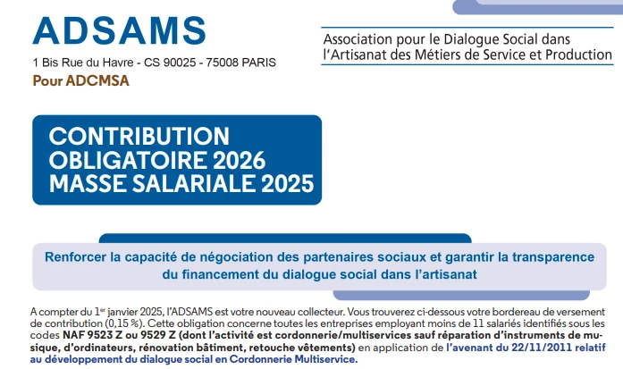 A compter du 1er janvier 2025, l’ADSAMS est le nouveau collecteur pour les contributions des codes NAF 9523Z ou 9529Z (dont l’activité est cordonnerie/multiservices, saufs cas exclus, voir le bordereau en pj)