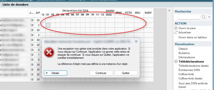 Depuis ce matin, quand je vais en onglet Production / Visualisation / Télédéclarations je n’ai aucune bulle qui apparaît. Et si je clique dessus je me fais éjecter de silae: