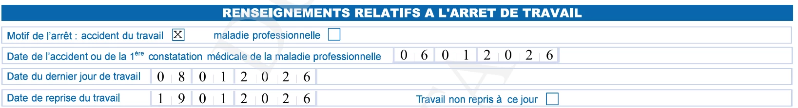 L’AT a eu lieu le 6 janvier et le salarié a été en arrêt à compter du 9 janvier jusqu’au 18 janvier. Il a repris son poste le 19 janvier 2026. Voici ce que j’ai renseigné sur Silae et sur l’attestation :