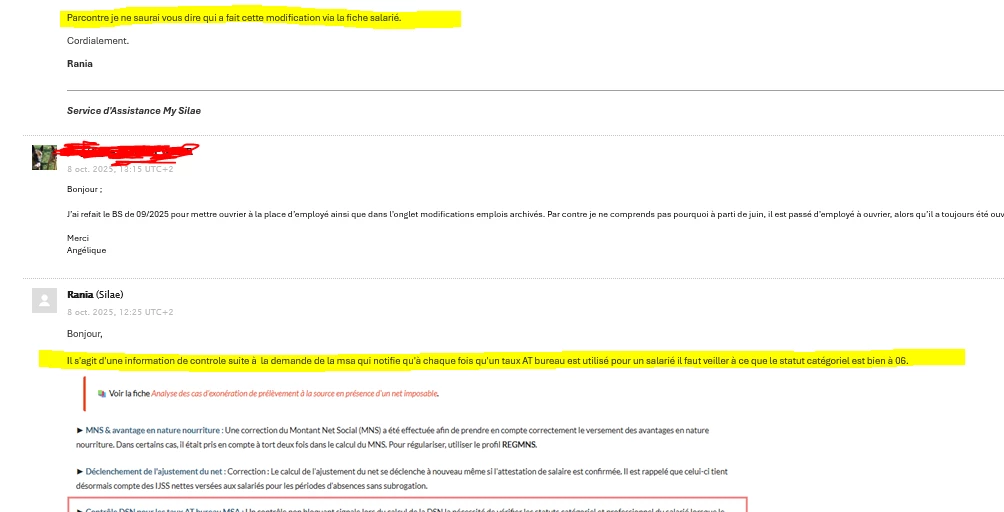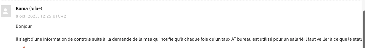 voici en gros le retour de Silaé Assistance, assez rapide. ​@Anthony Petit : il existe un souci sur les dossiers MSA et un taux AT bureau, à voir en interne