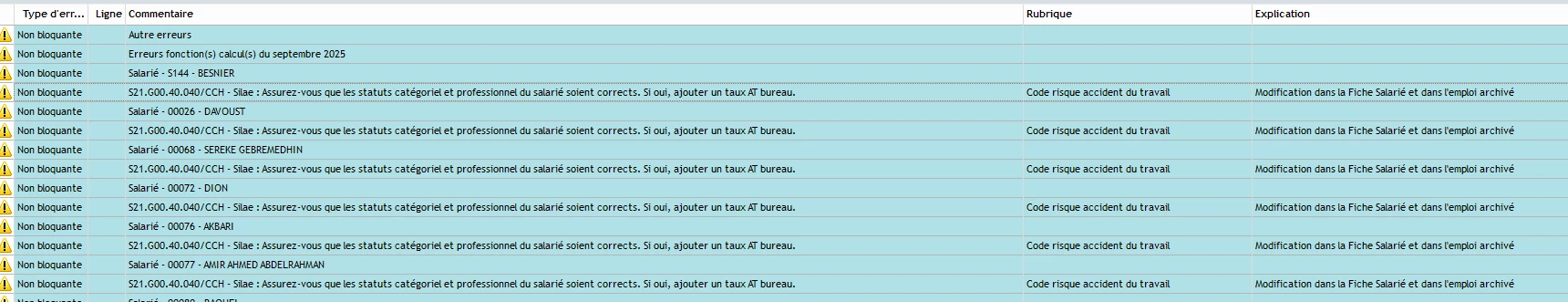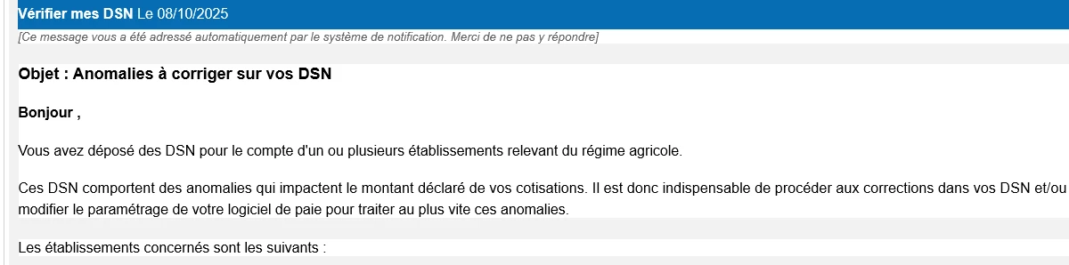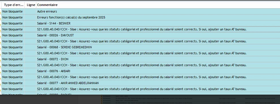 Aujourd’hui, lors du calcul de la DSN, une erreur non bloquante est apparue sur un dossier, concernant l’ensemble de mes salariés.