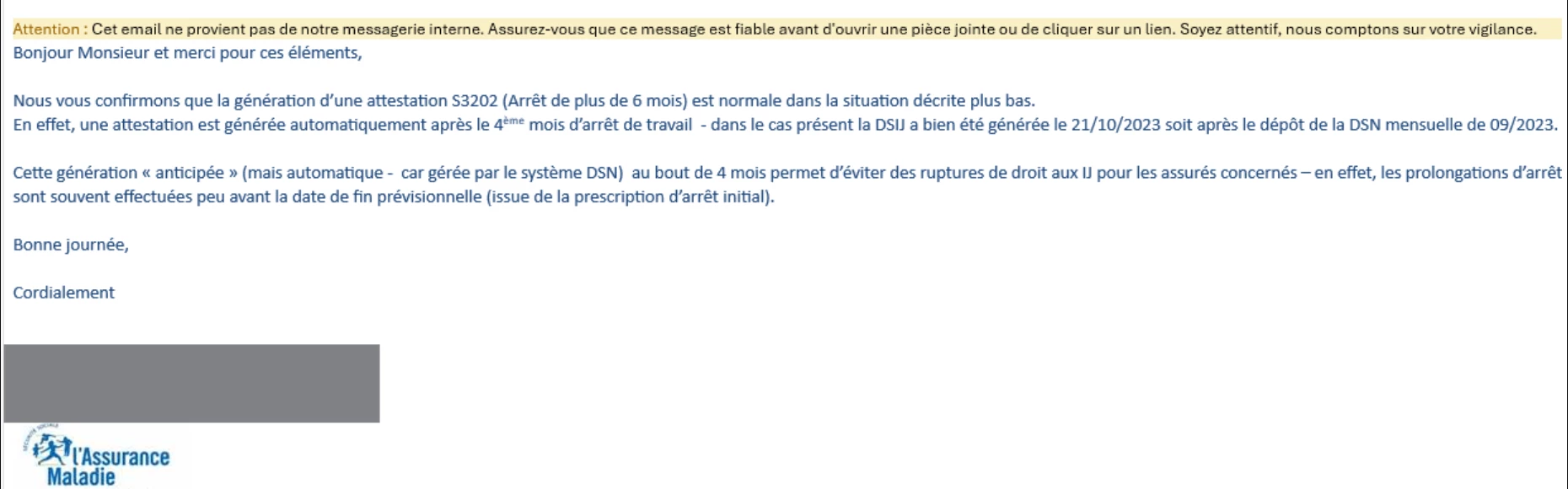 En envoyant une DSN mensuelle, j’ai reçu une anomalie DSN sur une attestation de plus de 6 mois “automatique” :