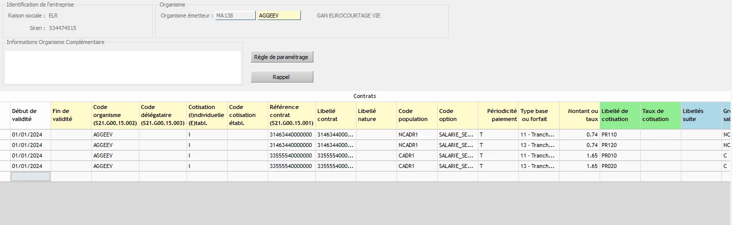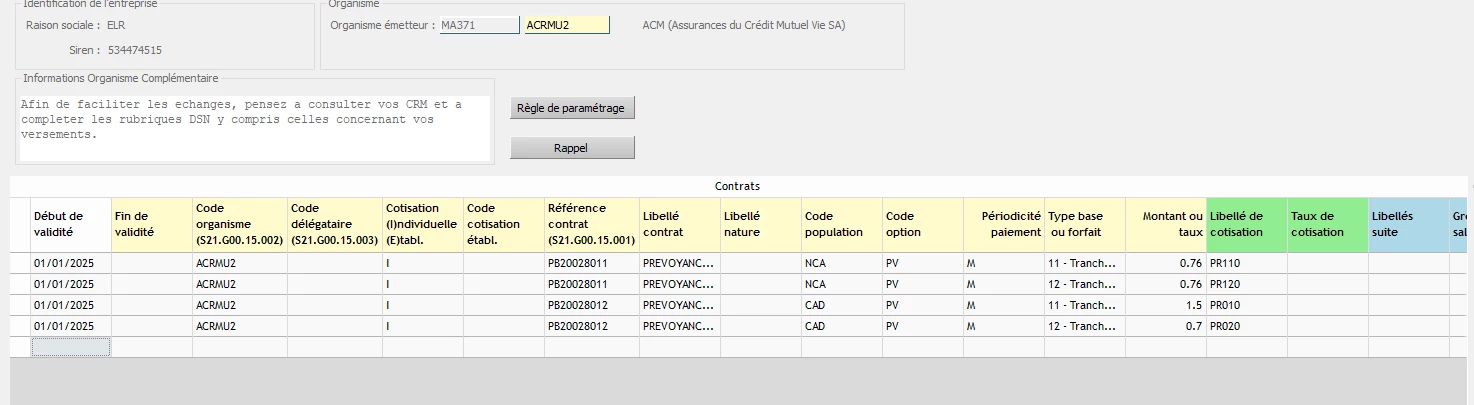 Il conviendrait alors d’affecter la Mutuelle au bon organisme (possiblement un nouveau) ou alors d’importer/paramétrer la Fiche DSN ACM incluant ce contrat Mutuelle.