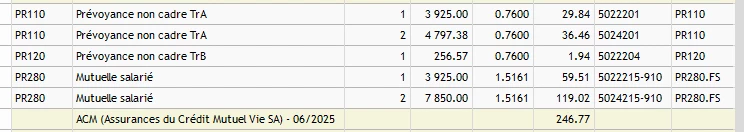Quant on regarde votre Organisme RPO “ACM” sur ce tableau des charges, vous y avez inclus la Mutuelle PR280/PR280.FS; cela explique le déclaratif d’une 2nde base au mauvais organisme/contrat.