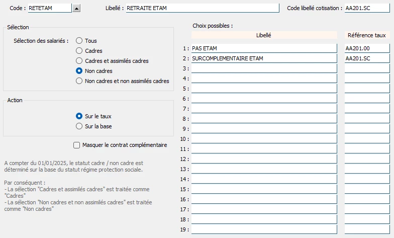 Un client dépendant de la ccn des cabinets dentaire a un contrat de retraite complémentaire avec AG2R. Sur ce contrat est présenté un taux pour les cadres et non cadres de “retraite supplémentaire”.