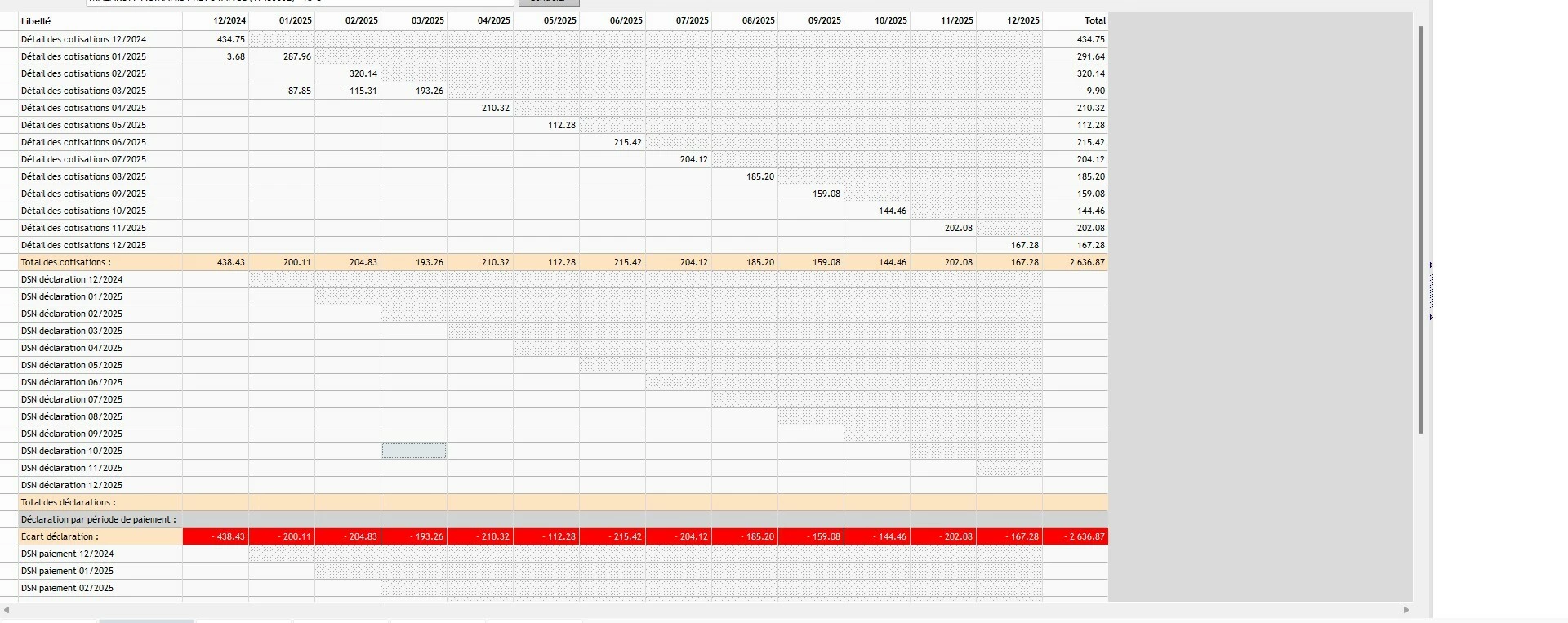 Je viens de réaliser un contrôle DSN sur un dossier, et ce tableau est anormalement vide. J’ai bien le détail des cotisations prevoyance, mais aucun montant dans la déclaration, ni même le paiement. Hors, le client a bien été prélevé de ces cotisations pour les montants indiqué dans la partie haute du tableau.