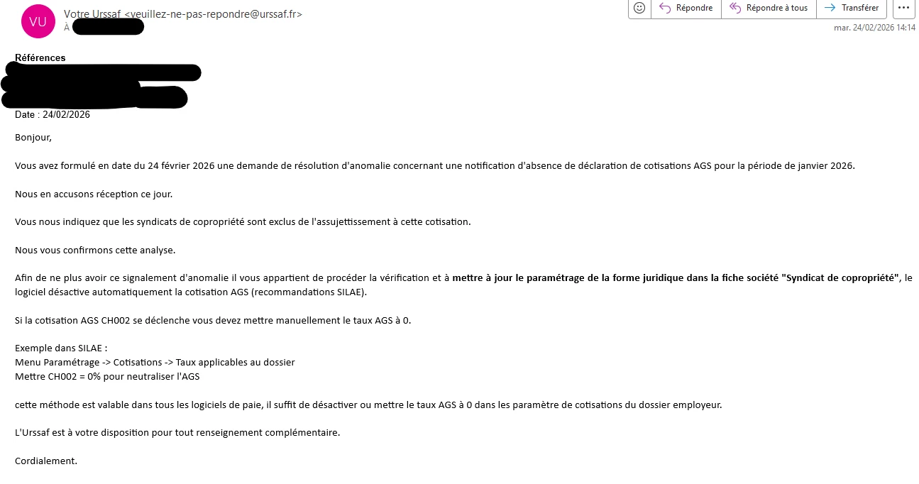 Bonjour, les syndicats de copropriété ne sont pas soumis à cotisation AGS. Faut il modifier manuellement la cotisation CH002 pour mettre les taux à 0, où existe il une autre méthode sur silaé?