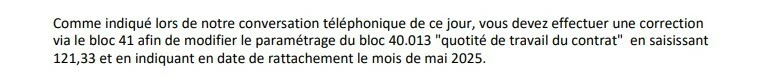 En mai dernier, une salariée en 121.33 heures par mois a eu une absence sur le mois en cours et cela a eu pour effet de modifier le bloc S21.G00.40.013 sur la salariée en question et est passé à 123.2 heures pour la quotité de travail.
