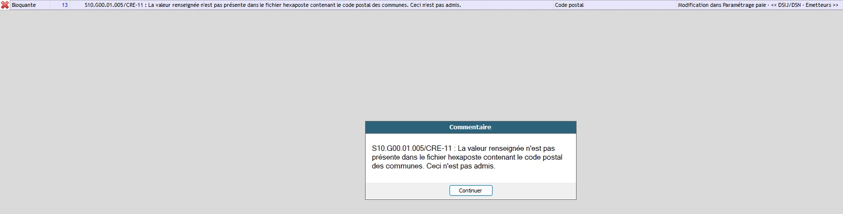 Il est indiqué ‘La valeur renseignée n’est pas présente dans le fichier hexaposte contenant le code postal des communes. Ceci n’est pas admis.” Dans la colonne explication, il est indiqué “modification dans paramétrage paie “DSIJ/DSN - Emetteurs”. J’ai été voir à cet endroit dans silae mais je ne comprends pas ce qu'il manque.