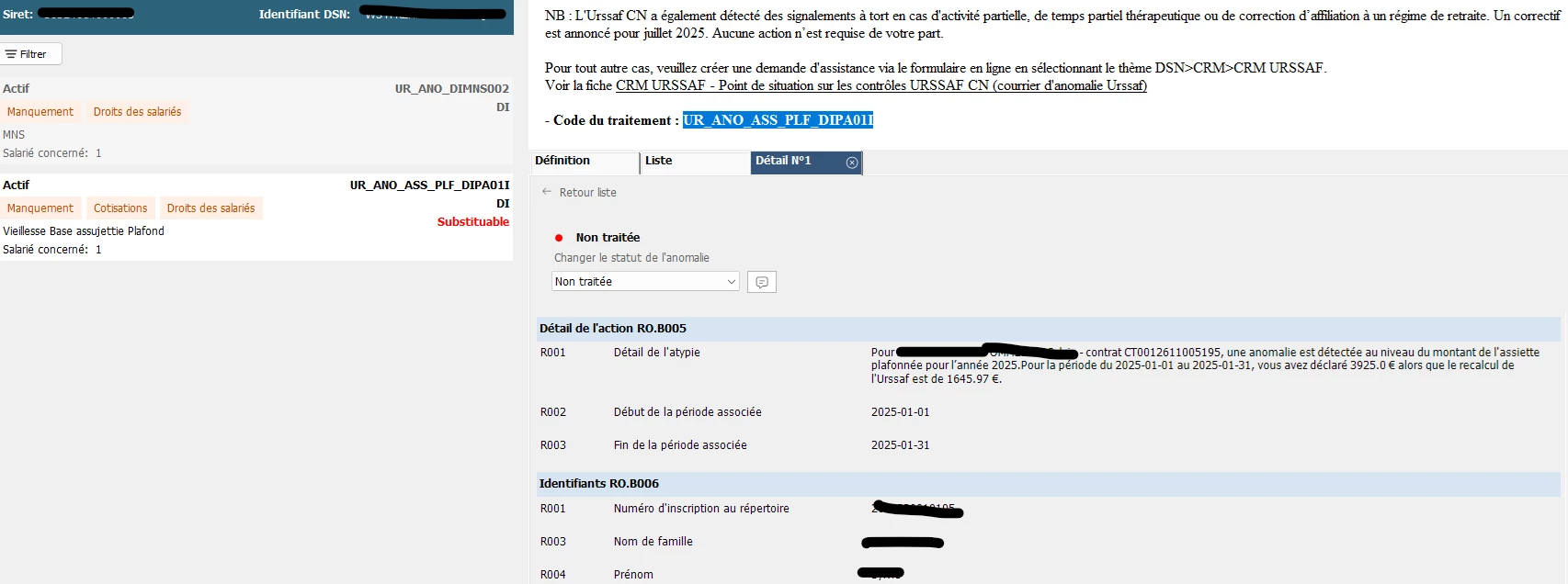 Impact donc sur plafond sécurité sociale non proratisé, avec code anomalie UR_ANO_ASS_PLF_DIPA011