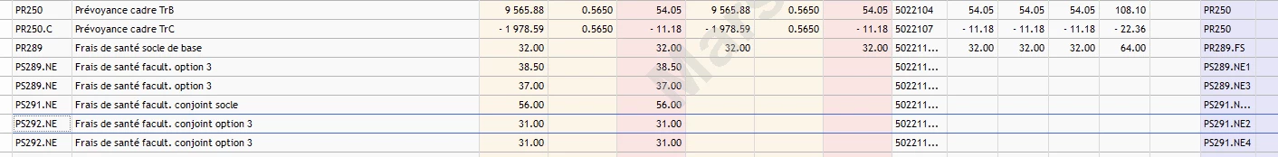 J’ai une option 3 (à 62 euros que Silae me répartie en 2 lignes à 31 euros) qui est en code PS292.NE et en taux de cotisation PS291.NE2 (voir photo)