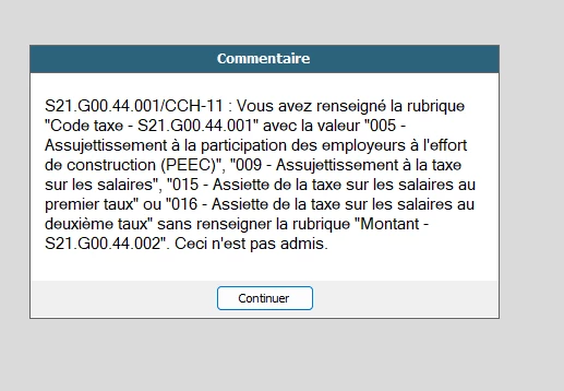 J’ai ce message d’erreur lors de mon calcul de la DSN de janvier (pour info le dossier est une reprise avec integration des DSN), j’ai vérifié la fiche société et je ne vois pas d’où ça vient sachant que rien n’est coché sur l’effort construction et que la société est bien soumise à la TSS. Pouvez-vous m’aider ? Je vous remercie par avance !