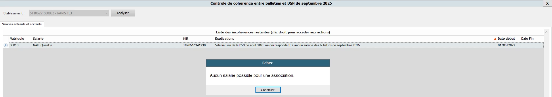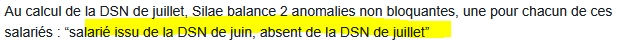 Au calcul de la DSN de juillet, Silae balance 2 anomalies non bloquantes, une pour chacun de ces salariés : “salarié issu de la DSN de juin, absent de la DSN de juillet”