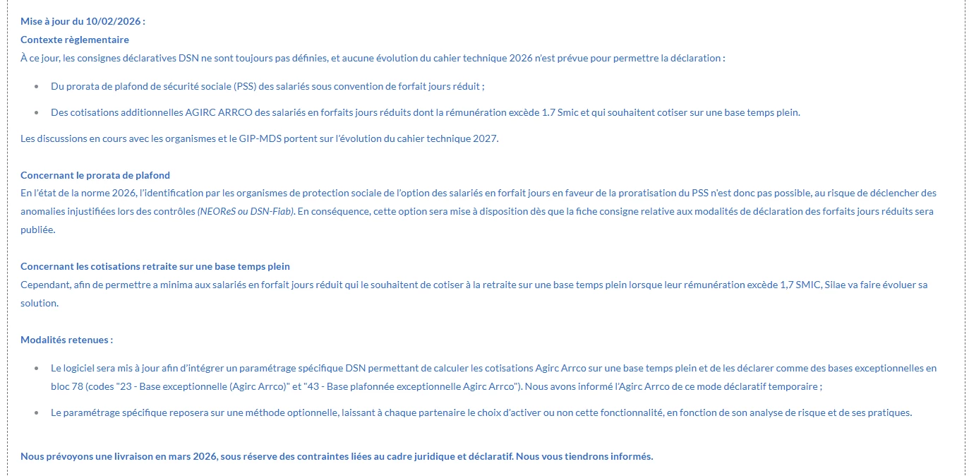 Suite à l'article du 27 mars 2025, savez-vous si une mise à jour de Silae est prévue concernant les forfaits réduits et la prise en compte des cotisations retraite à temps plein ? Actuellement, cette option n'est pas disponible pour les forfaits réduits, contrairement aux temps partiels.