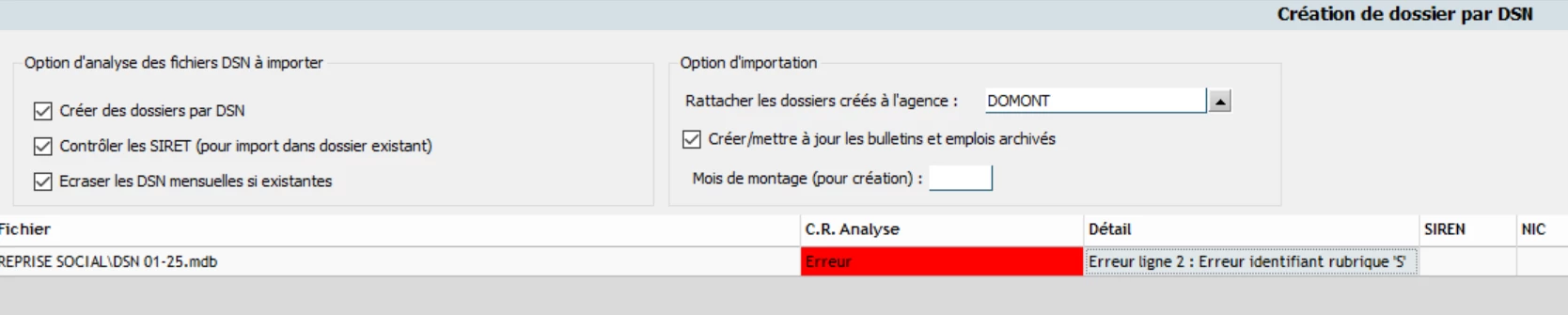 Je dois monter un dossier, je récupère à l’instant les DSN et ignore le logiciel de paie utilisé et au moment de l’import , immédiatement j’ai ce message ci dessous