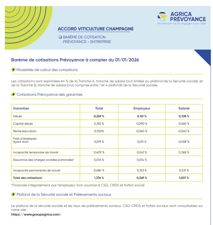 - E052 Exploitations viticoles de la Champagne : Prévoyance : Mise à jour des taux prévoyance au 01/01/2026 (doc AGRICA)