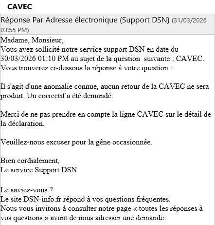 Depuis la mise en place de la norme 2026 des DSN, nous constatons que l’organisme CAVEC apparaît à tort sur tous nos comptes rendus métier consultables sur net-entreprises :