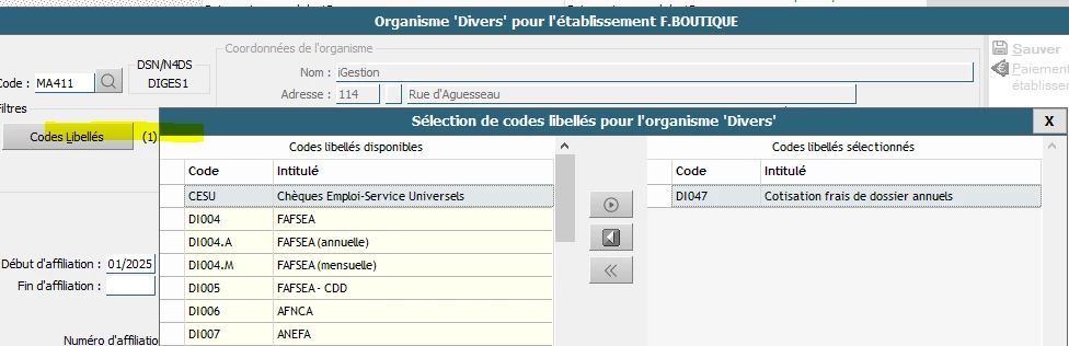 Les libellés sont bien intégré à l’organisme DIVERS.